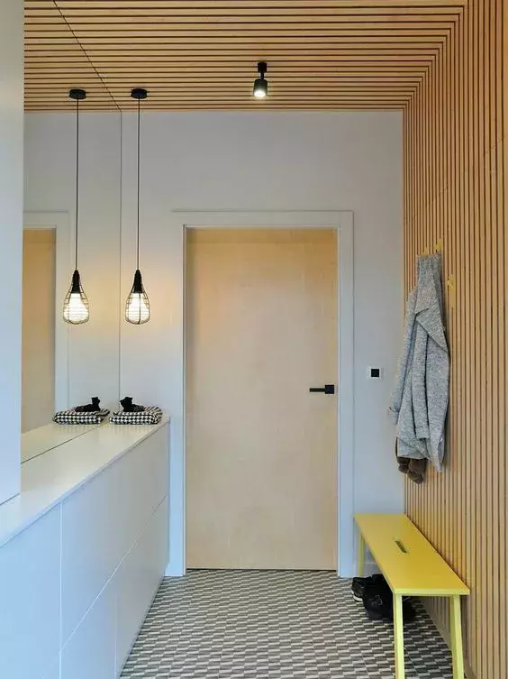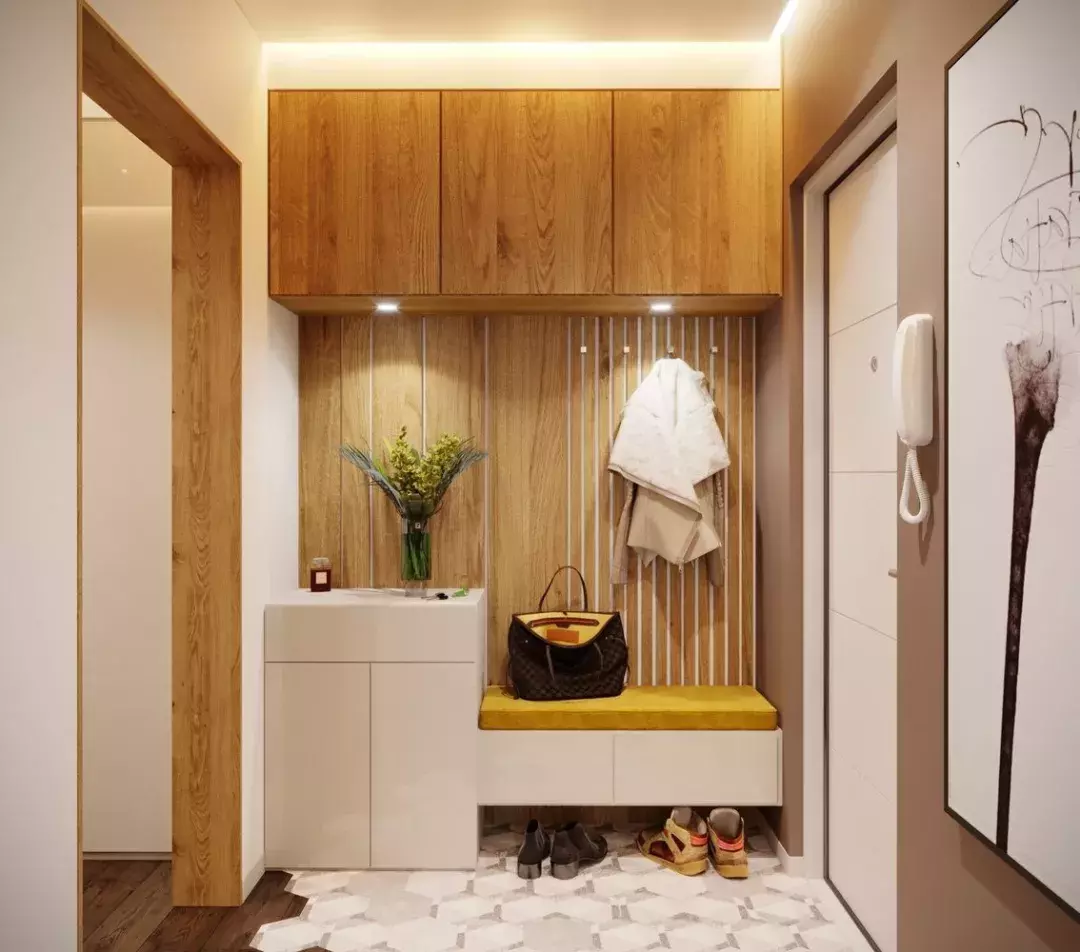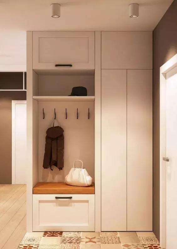哪怕小户型没有玄关走廊,也要利用墙面空间来做鞋柜,玄关鞋柜和换鞋凳组合起来,让我们日常更换鞋子也更方便一些。