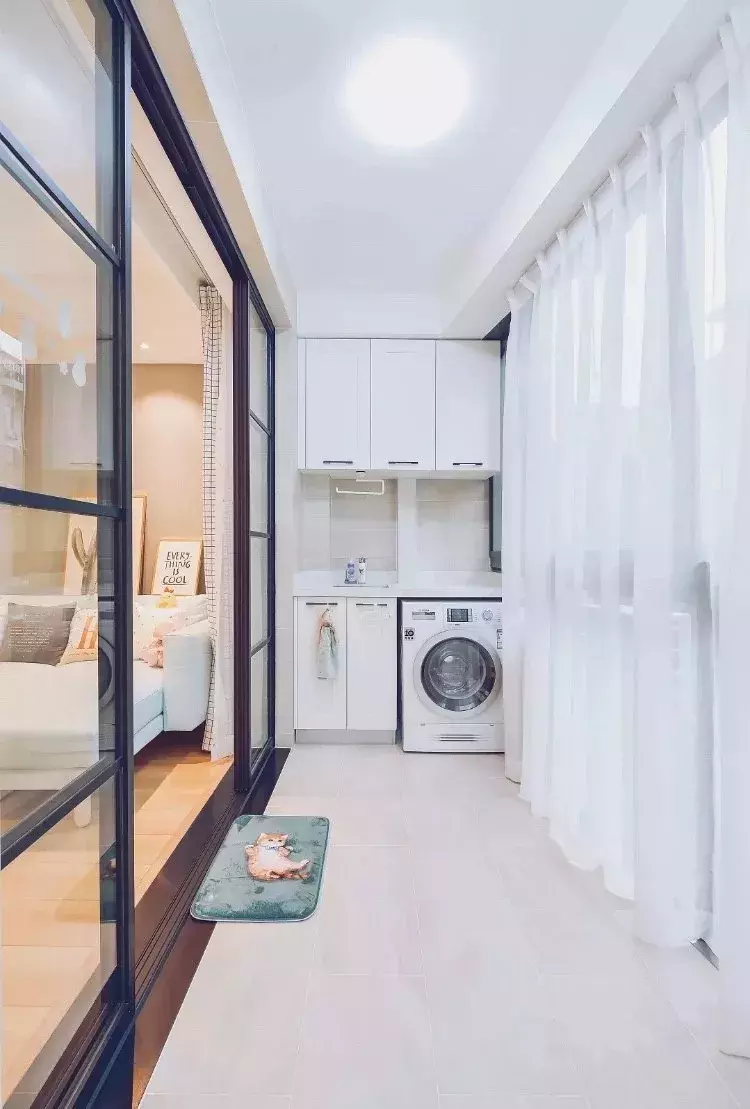 阳台在小户型里通常作为洗衣房来使用,底部做洗衣机和洗手台,上方就可以利用起来做吊柜,一些清洁用品、不常用的杂物都可以放在阳台。