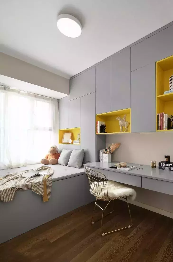 卧室里还可以选择把床底的空间也利用起来,比如很适合小户型的榻榻米床搭配衣柜和书桌柜的设计,可以让卧室多出几个平方的储物空间。