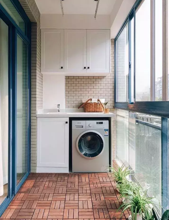 而且阳台的左右两侧都可以利用起来做收纳,其中一侧要摆放洗衣机,另一侧就可以做到顶的柜子,使用上会更方便一些。