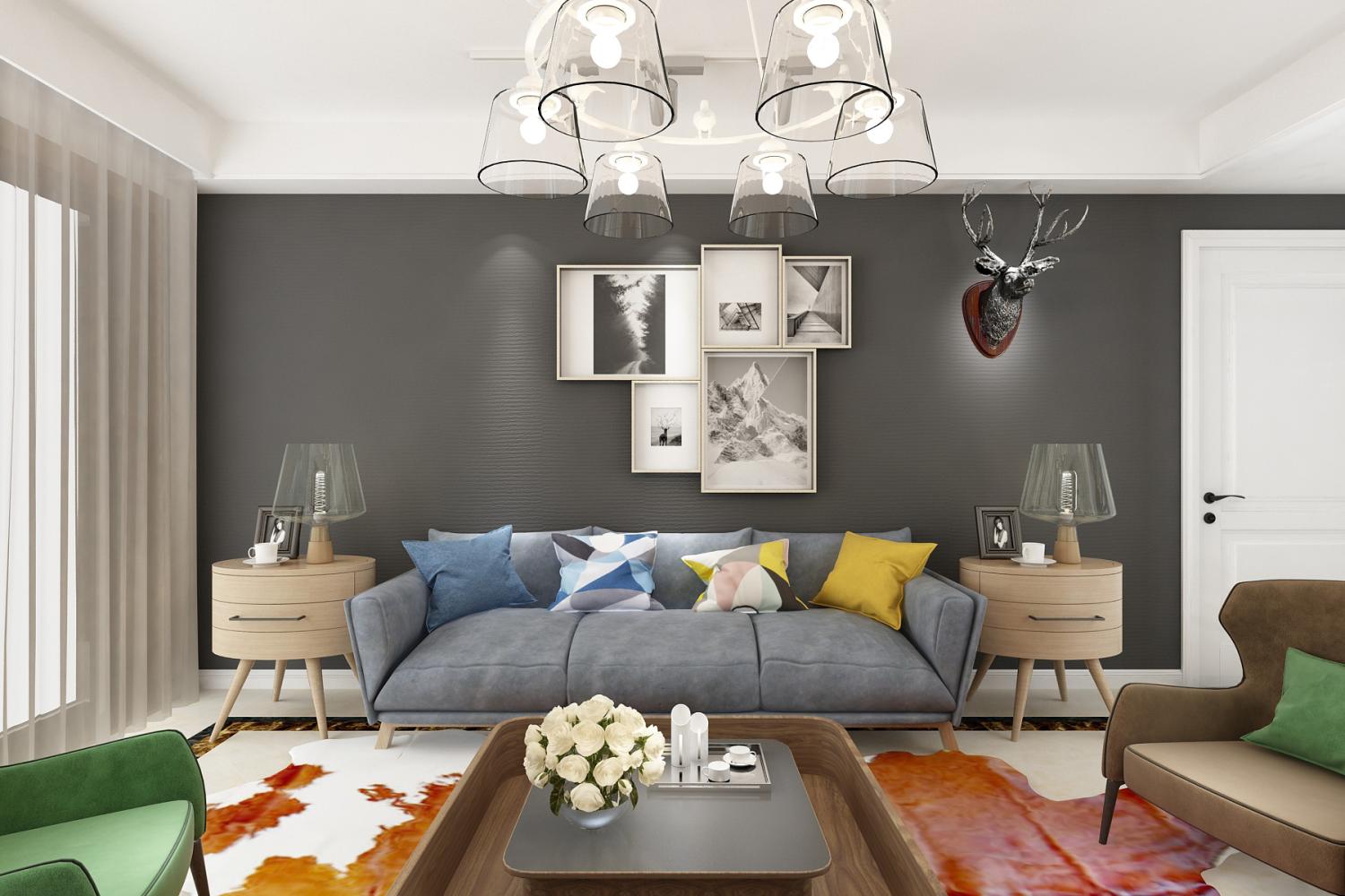 客厅这样装修非常简单大方,既省钱又漂亮,大家不妨借鉴一下,室内墙壁上采用了高级灰色的格调,为了让客厅显得更加丰富多彩,还在沙发背景墙上装饰了一组精美的壁画,在灯光的映衬下,把客厅映衬得更加时尚有活力。