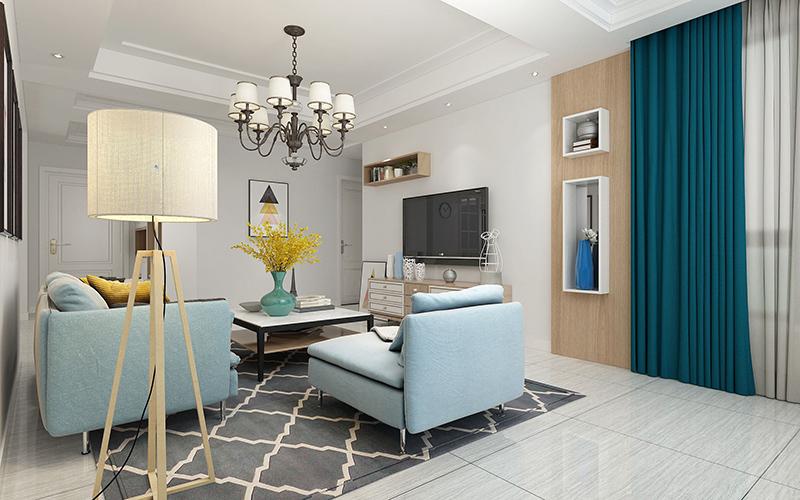 餐客厅之间采用开放式的设计,能够使得空间显得更加敞亮大气,室内墙壁上采用了蓝色的格调,搭配灰色的布艺沙发,非常时尚漂亮,在沙发下面还有几何图案的地毯装饰,大大提升了客厅的档次感和舒适度。