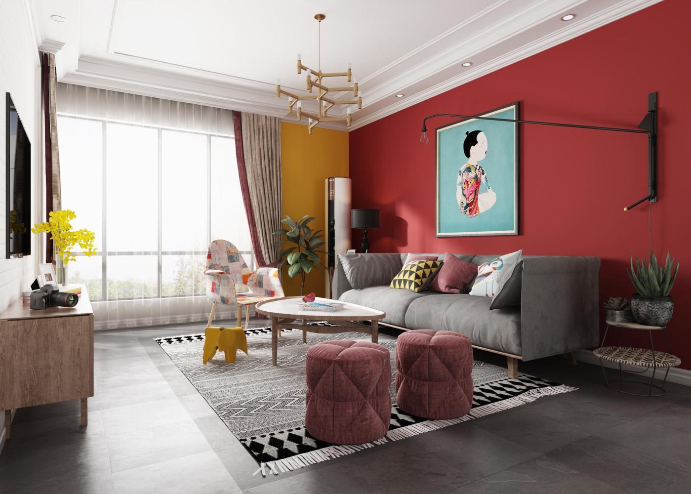 客厅这样装修非常时尚有活力,沙发背景墙上采用了红色的格调,与高级灰色的地板非常好的搭配在一起,在红色的墙壁上还安装了一幅大尺寸的壁画,蓝色的壁画与红色的墙壁非常好的搭配在一起,非常时尚漂亮。