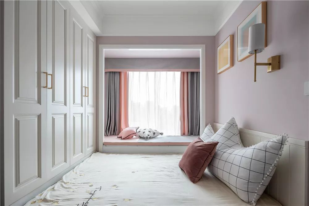 ▲飘窗挨着床铺,垫上粉色的布垫,结合灰粉配的窗帘,呈现出一种温馨自然的浪漫。