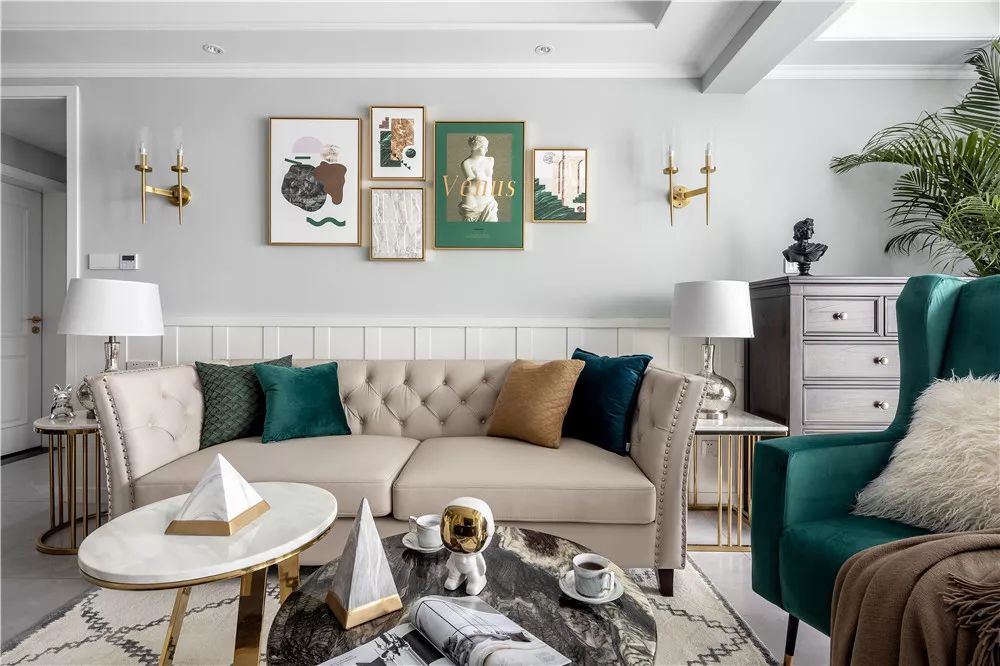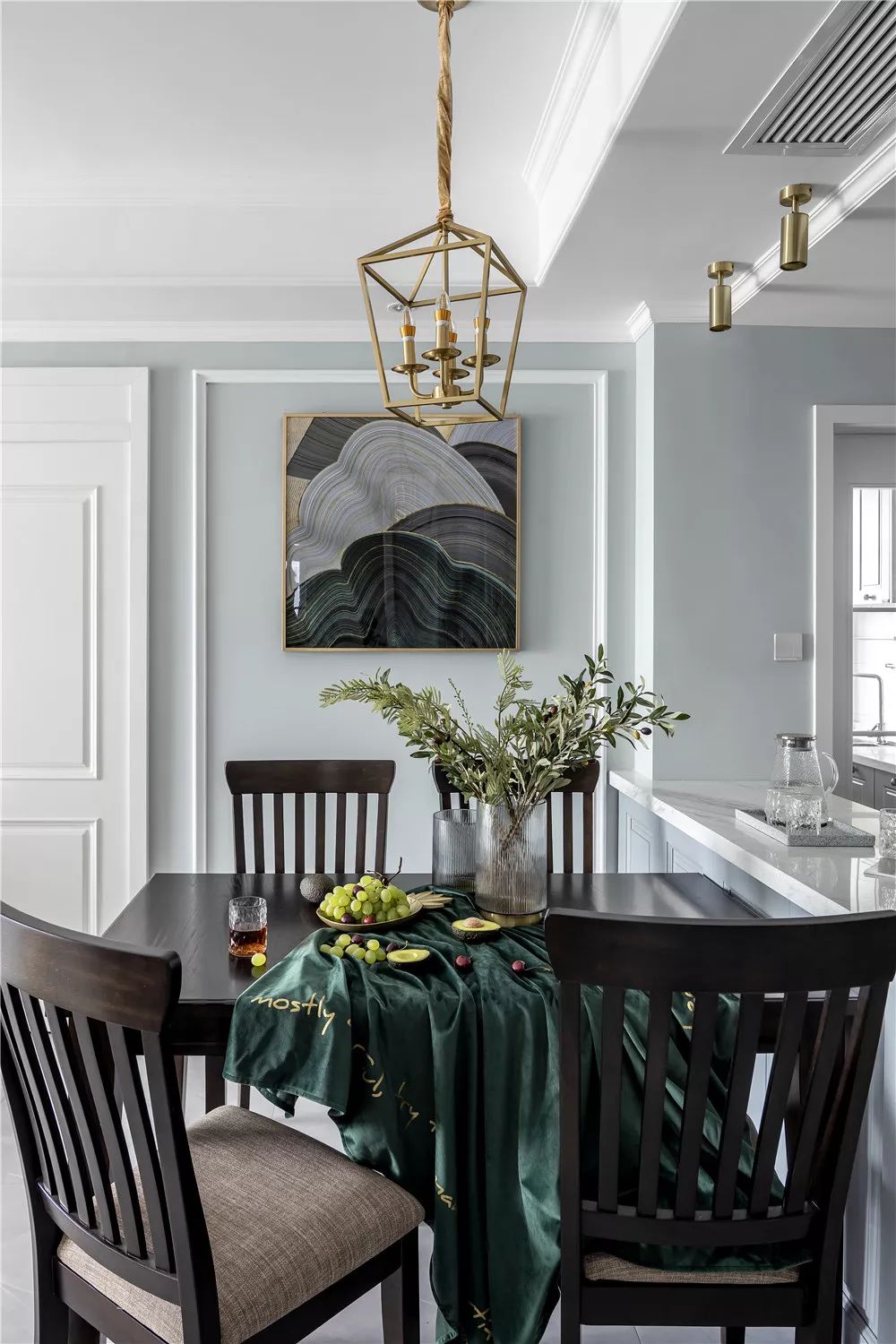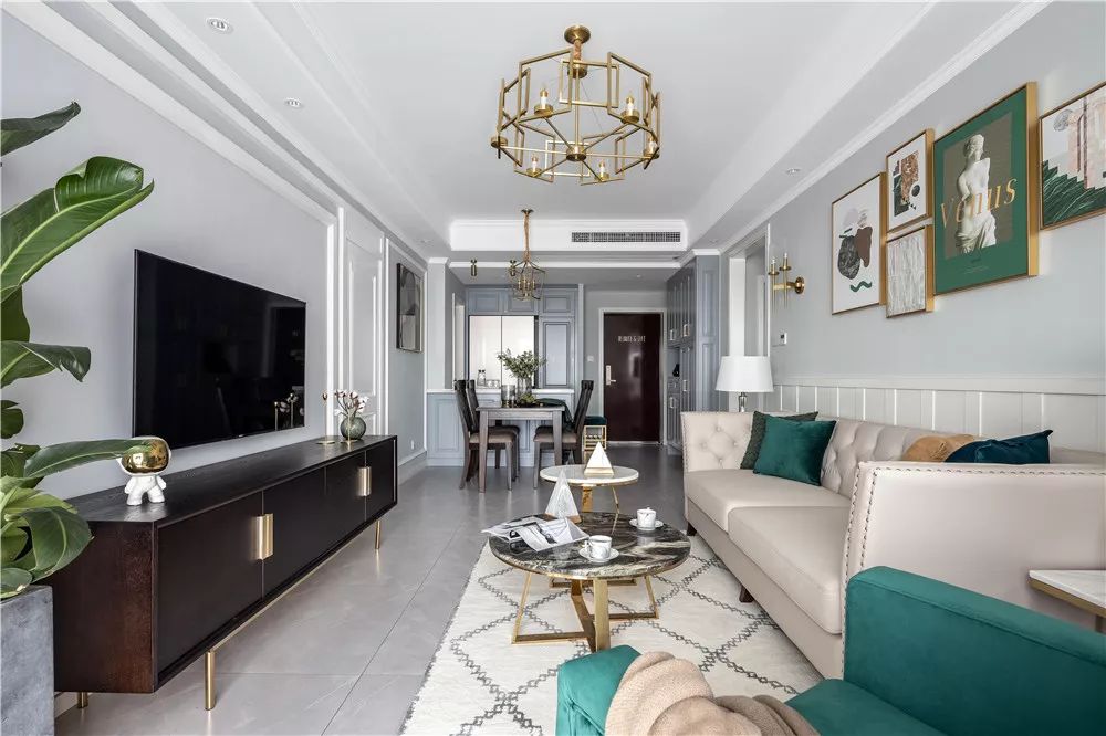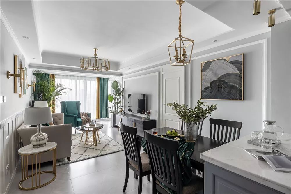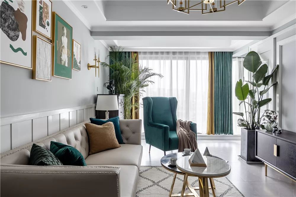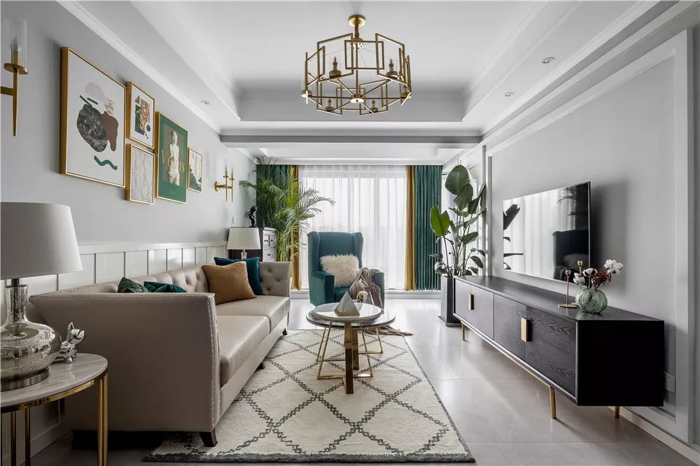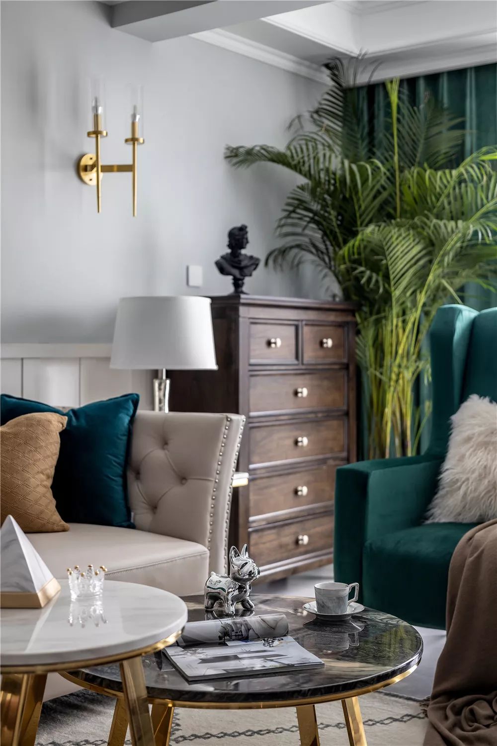 在这套120平米的房子中,整体硬装以现代美式的线条感,通过轻奢的铜质家具,搭配上森系的细节布置,营造出一个温馨华丽的档次空间感。