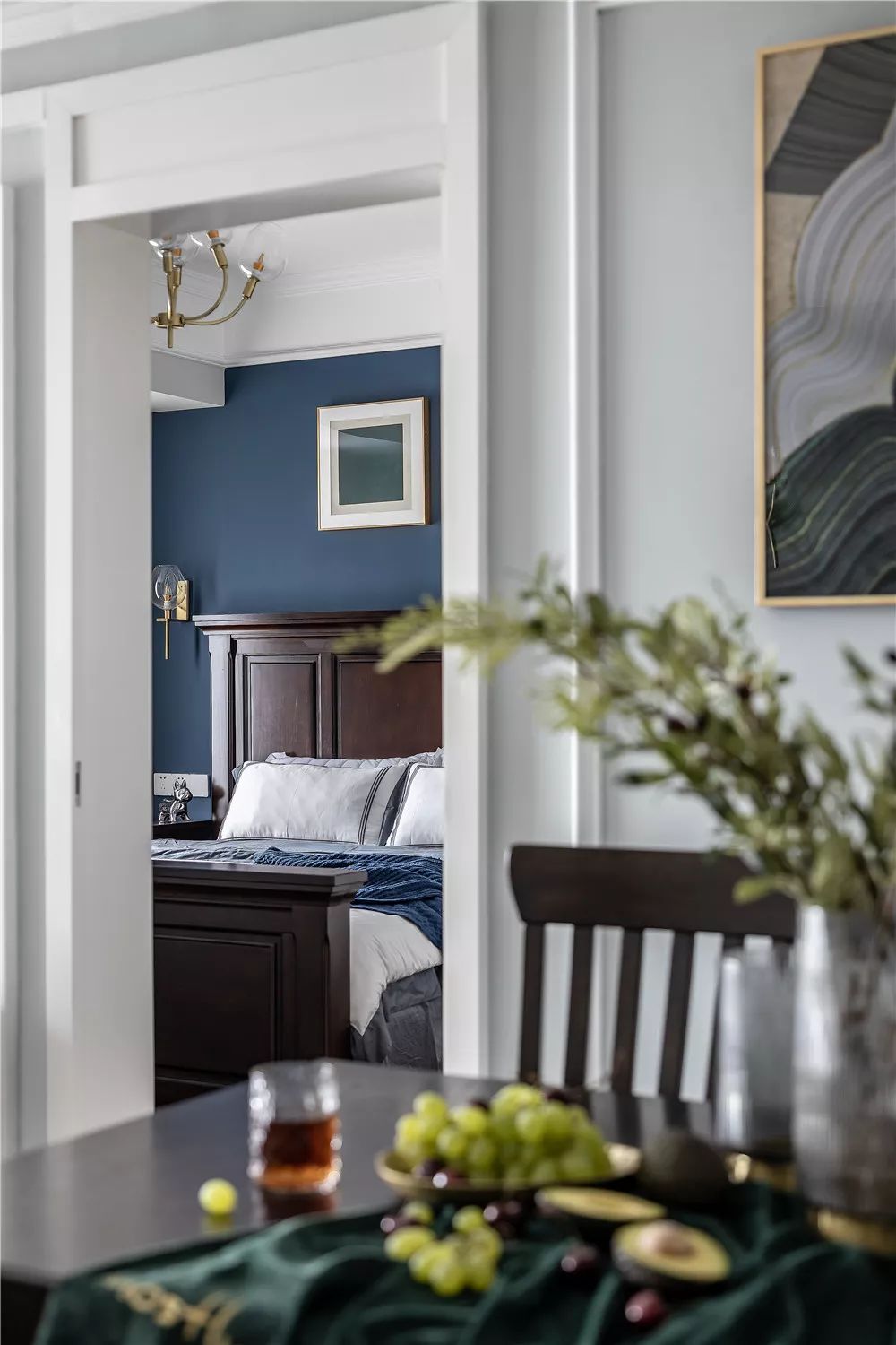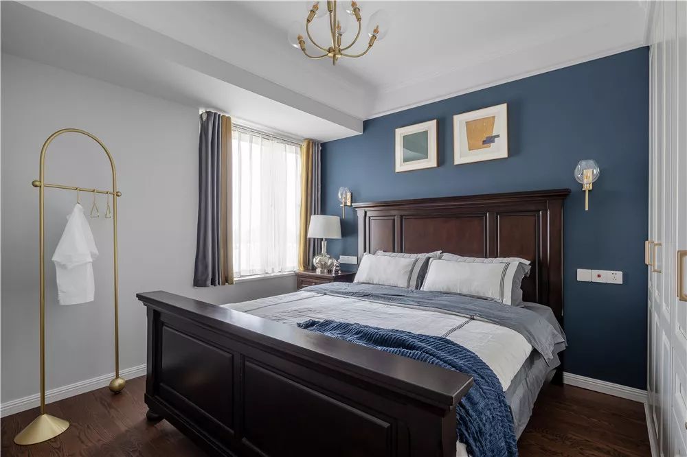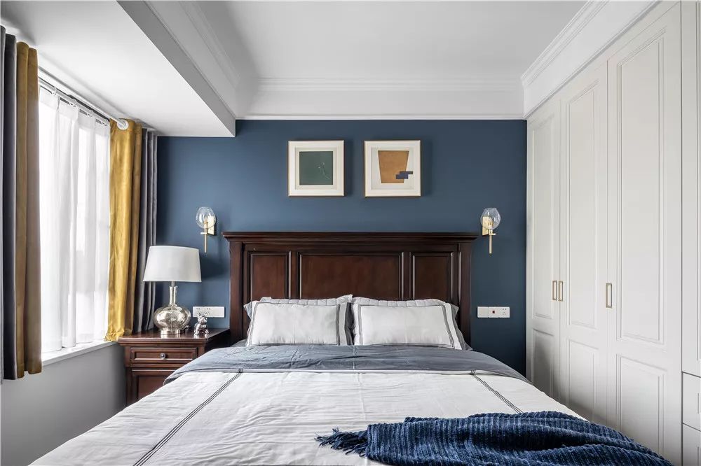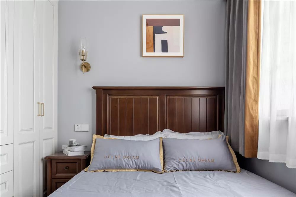 ▲次卧空间相对紧凑,床铺贴窗的墙面布置,床头墙一幅抽象挂画,结合实木美式床+灰紫色床单,整体空间显得简洁稳重而自然。