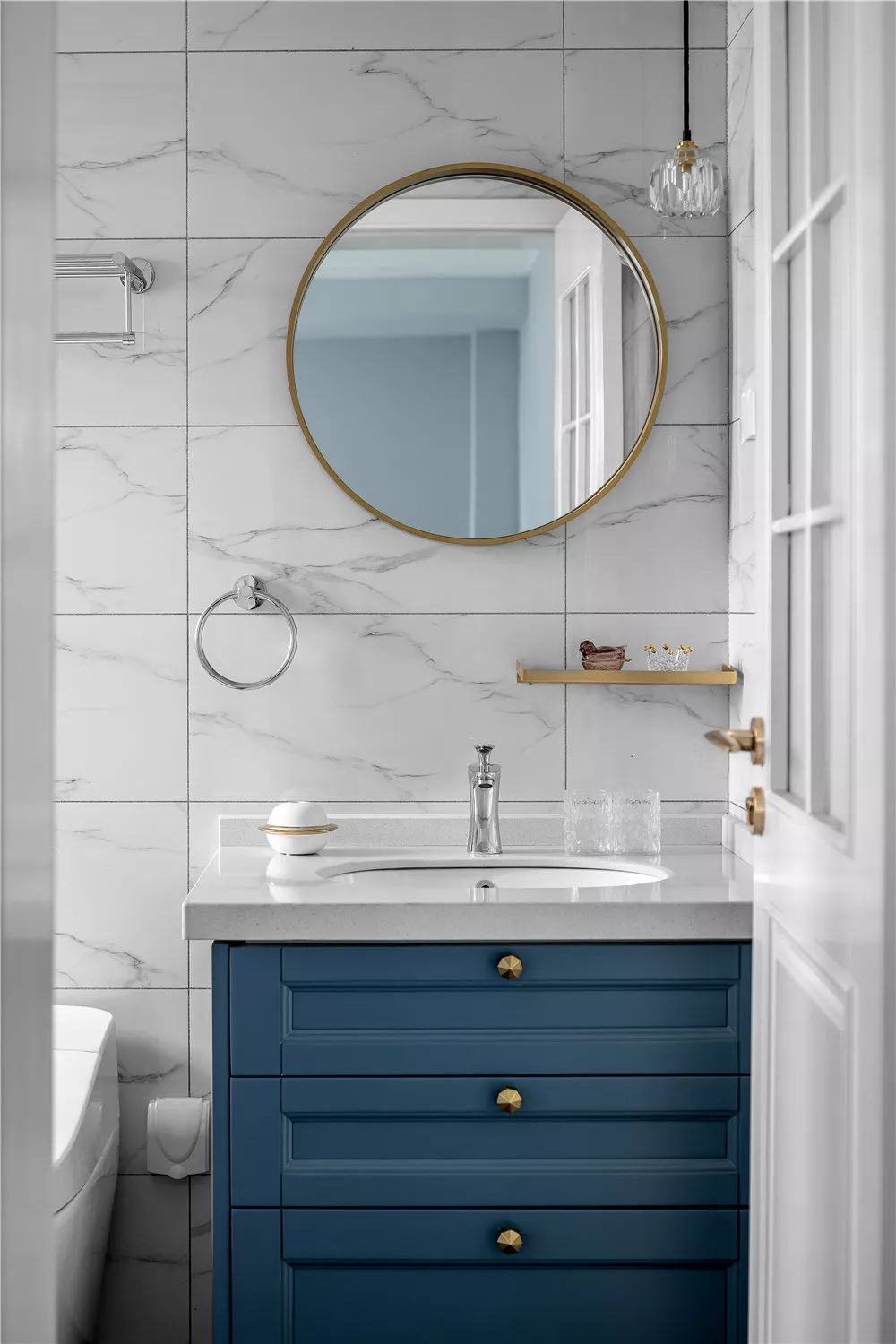 ▲卫生间在雅白的墙面基础,搭配一个蓝色的洗手盆柜,墙面一面圆形的挂镜,使得空间充满安静优雅的华丽感。