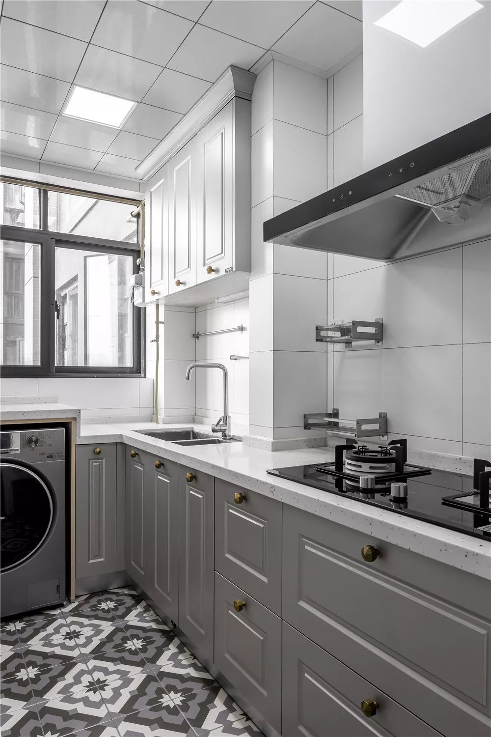 ▲厨房在灰白配的花砖地面基础,搭配灰色橱柜与白色的墙面砖、吊柜,提供了一个简洁时尚的烹饪空间。