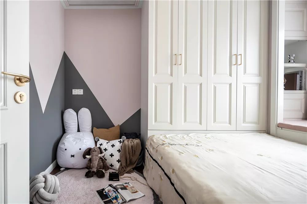 ▲儿童房的墙面做了一个创意的拼色造型,暗灰色+粉色的搭配,地面上圆形粉色的地毯+可爱的小公仔布置,使得空间充满了优雅舒适的公主范。