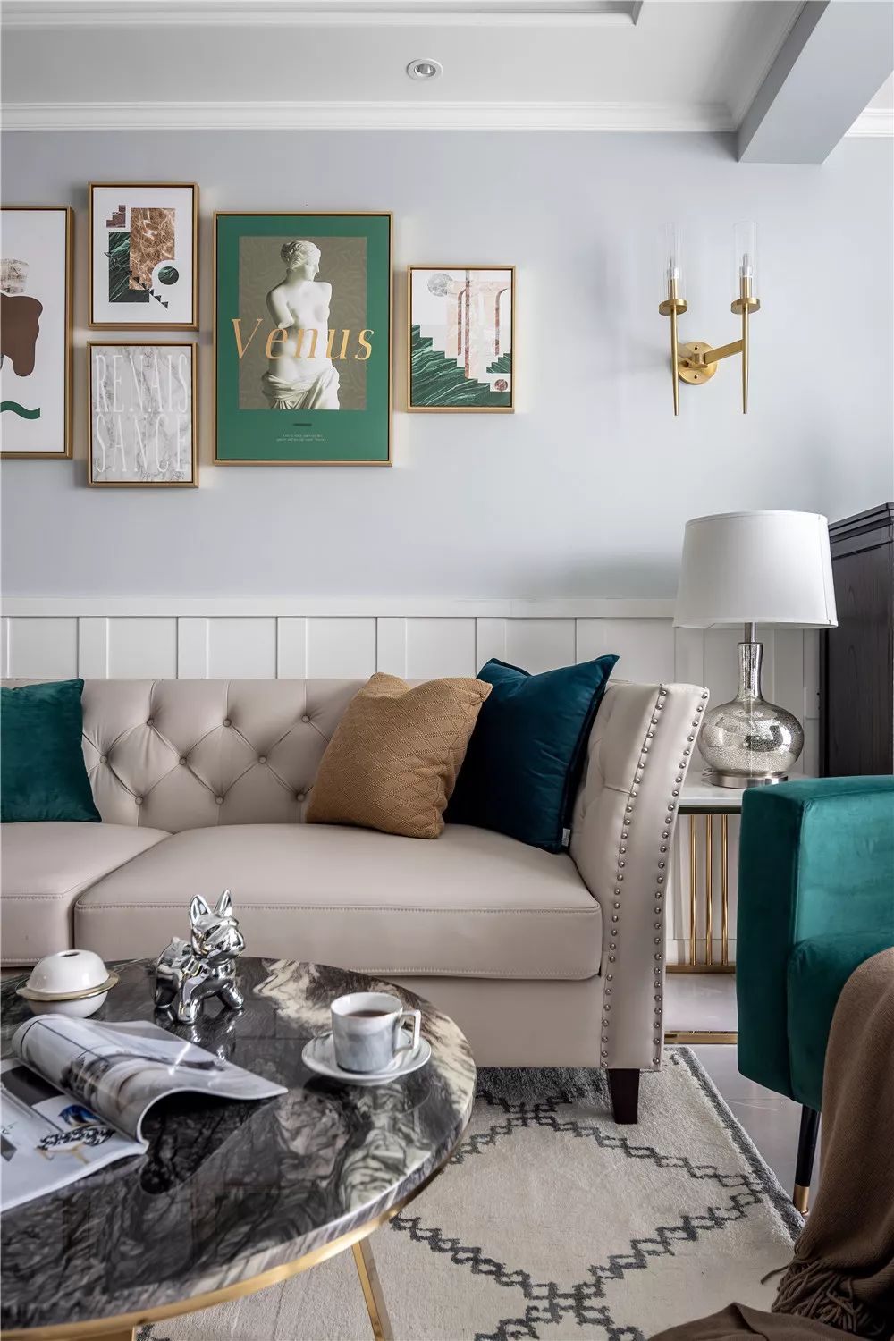 ▲米白色皮沙发,沙发墙上挂着铜色壁灯与装饰画,白绿铜色的搭配,显得艺术感满满。