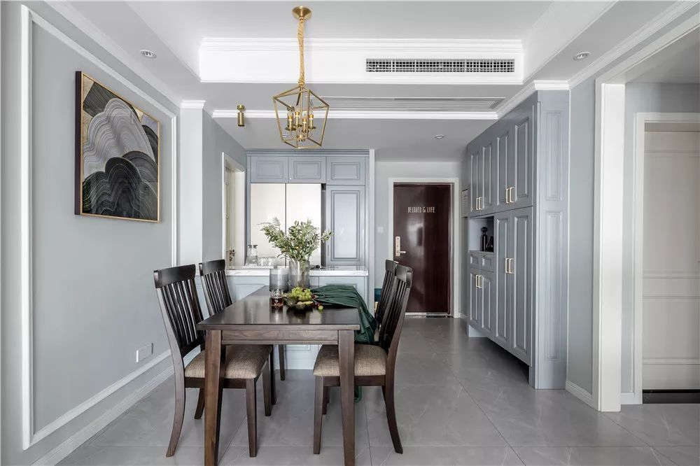 ▲餐桌靠着吧台,这个吧台可以作为西厨的操作台,结合墙面的波浪纹灰调挂画,为主人带来一种时尚端庄的用餐体验。
