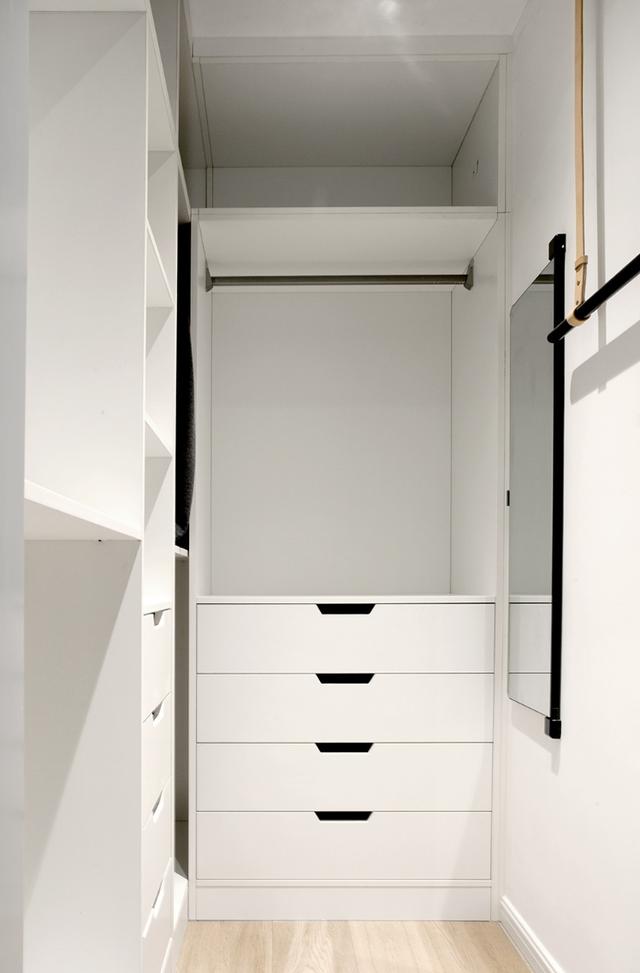 借助主卧空间后隔出的迷你衣帽间,再次保证了家里的储物收纳功能,旁边墙体则安装了一面镜子,以及一组简易的挂衣架。