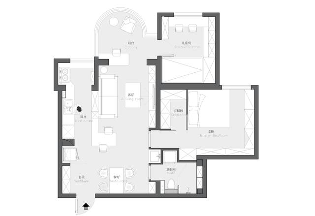 通过设计好的方案来看,除了大量的柜子设计,结构这块也改动挺多的。比如进门对面增加了一个玻璃隔断、将洗衣机设计到卫生间里、厨房以开放式来处理、主卧室一分为二增加一个衣帽间、小孩房的门从阳台进等等。具体通过下面的实景,给大家好好分析一下。