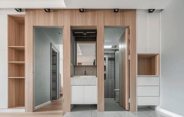 卫生间与主卧室的门,都采用了隐形处理,而台盆柜则是放在了两个门中间位置。当然,卫生间旁边的角落处依然做了一个柜子。看得出来,屋主很看重家里的收纳空间。也正如她所说,只有真正入住了,才知道自己的需求是什么。