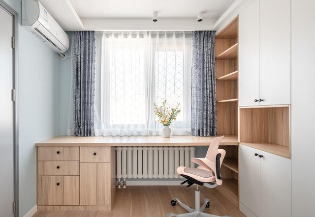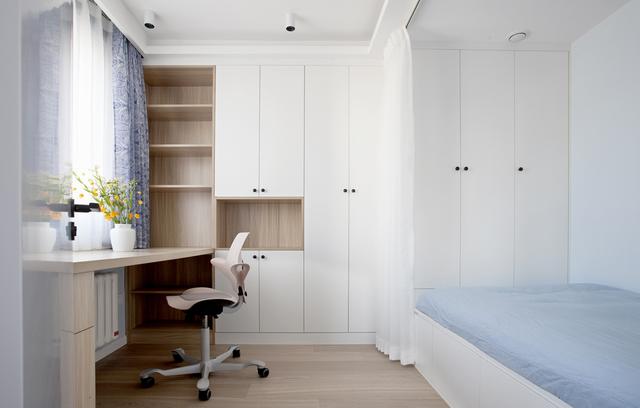 小孩房的床采用了榻榻米结构来设计,也是现在比较流行的做法。不过有一点要提醒大家,就是若把榻榻米当作床来使用的话,一定要在床板上做好透气孔,以避免出现潮湿问题。窗台处则自然是书桌及书柜组合了,来解决孩子的学习需求。