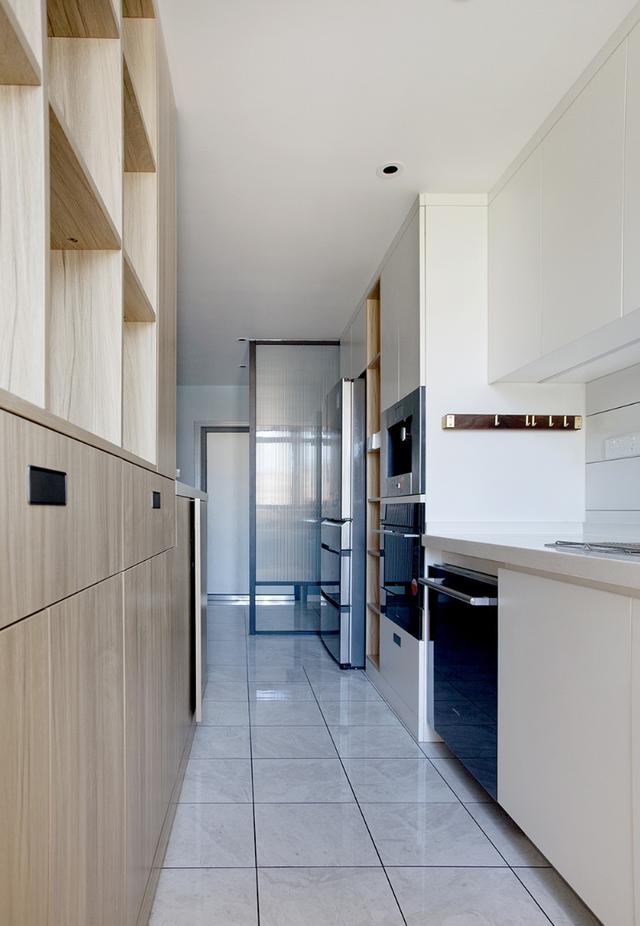 从餐厅看向门厅视角,玻璃隔断背面同样做了一组柜子,并与厨房橱柜相连,以提高整个厨房的收纳空间。而像冰箱及厨房小电器,则很好的嵌在了这个柜子当中,既不占用空间,也显得工整多了。