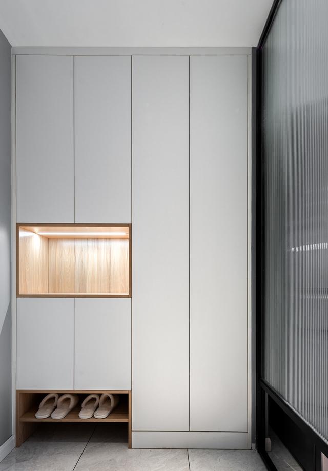 进门对面的玻璃隔断设计,既起到了独立玄关的作用,也为敞开式的厨房,起到了隐私遮挡作用。进门左手边的位置则设计了一组鞋柜。当然,鞋柜结构的设计也非常实用。比如左边柜体部分,下面做敞开隔层,方便收纳鞋子,中间留孔并配置灯光,方便随手放点东西以及增加气氛。而右边的柜体,则可以用来收纳衣物。