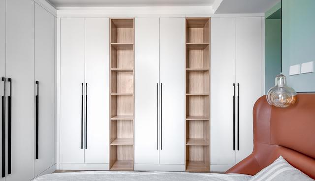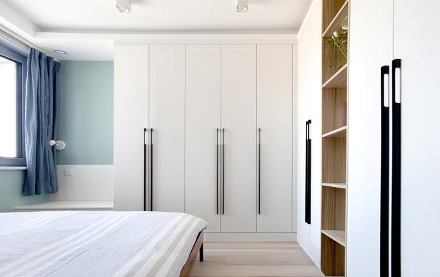 为了节省出更多的空间来做柜子,主卧的床选择了靠墙摆放。或许这样布局可能不太好看,但实用性这块真的没话说。