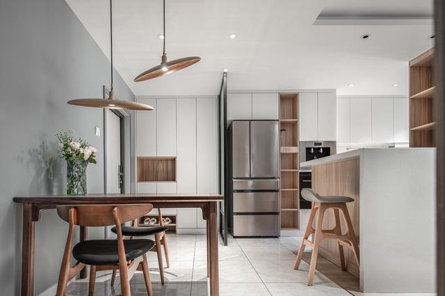餐厅整面墙刷上了灰色的乳胶漆,搭配上原木色的家具,以及白色的柜门后,看起来既显得很清新,也相当有格调。