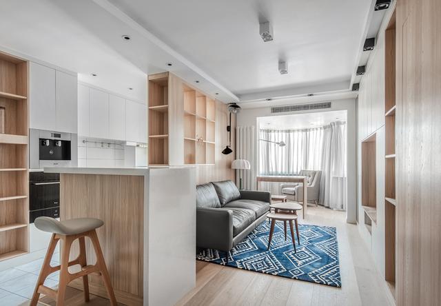 考虑到沙发隔断柜后期会摆放很多东西,所以就在这九宫格隔层处安装了一块透明玻璃背板,这样不仅不影响通透性,对客厅来说也有了一个保证。避免隔层上收纳的东西洒过来,或者砸到家里的小孩。同时,为了将空间给完全利用起来,还顺着隔断柜做了一个转角吧台,为客厅增加一抹休闲趣味性。
