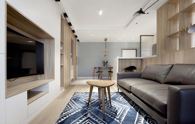 从阳台看向整个客餐厅视角,开间虽说不大,但视野感也还不错,并没有想象中那么小。而电视墙这里,也是以组合柜子为主的。
