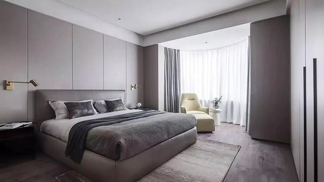 ▲在侧边墙面加入木饰面,床头墙也是灰色的硬包为背景,搭配灰色皮艺床,布置简约素雅的床单,精致成熟的床头柜摆饰,也让卧室显得更加优雅高级。