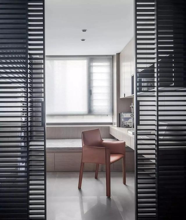 ▲玄关旁边的是书房,以百叶造型作为空间的隔断,定制上书桌+飘窗组合,还有一张棕色的椅子,提供了一个现代舒适的工作或阅读空间体验,累了也可以坐在飘窗上休闲放松。