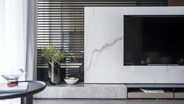 ▲电视墙以地台+矮墙的组合设计,后方是书房,加入玻璃隔墙与百叶帘的组合,带来一种优雅而明亮的宽敞视觉感。