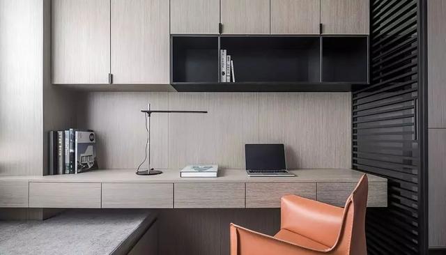 ▲木质感的定制书桌书柜,书桌上方加入黑色的开放书架,侧边还有黑色百叶帘搭配,整体自然舒适的空间,显得端庄而又高级大气。
