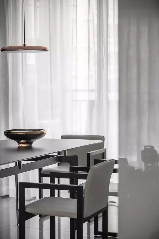 ▲餐桌上简约现代的摆饰品,与托盘造型的玫瑰金色吊灯搭配,拉起纱帘后,整个客餐厅氛围显得明亮舒适而自然惬意。
