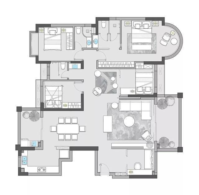 ▲客厅整体现代大方的空间基调,布置上舒适华丽的家具软装与细节装饰,在无主灯的空间氛围下,呈现出一种自然优雅的轻松与惬意感。