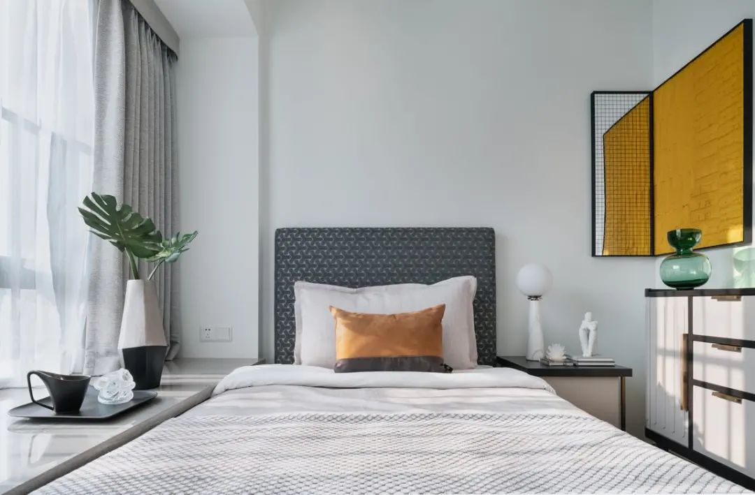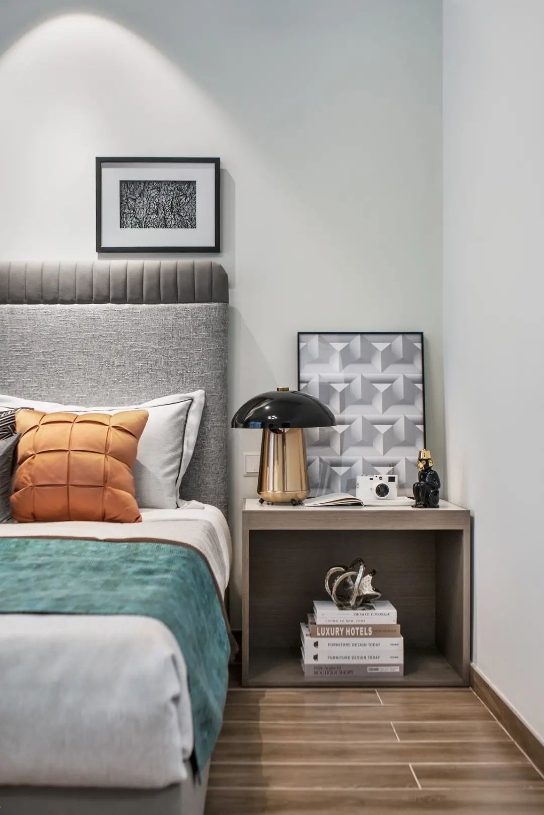 ▲卧室在浅灰色的空间基础,床头墙挂一幅黑白调,布置灰色的布艺床,床头柜上轻奢高级的台灯与装饰品布置,整个空间显得格外的简约温馨而舒适。