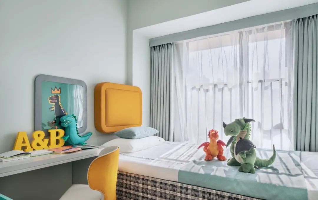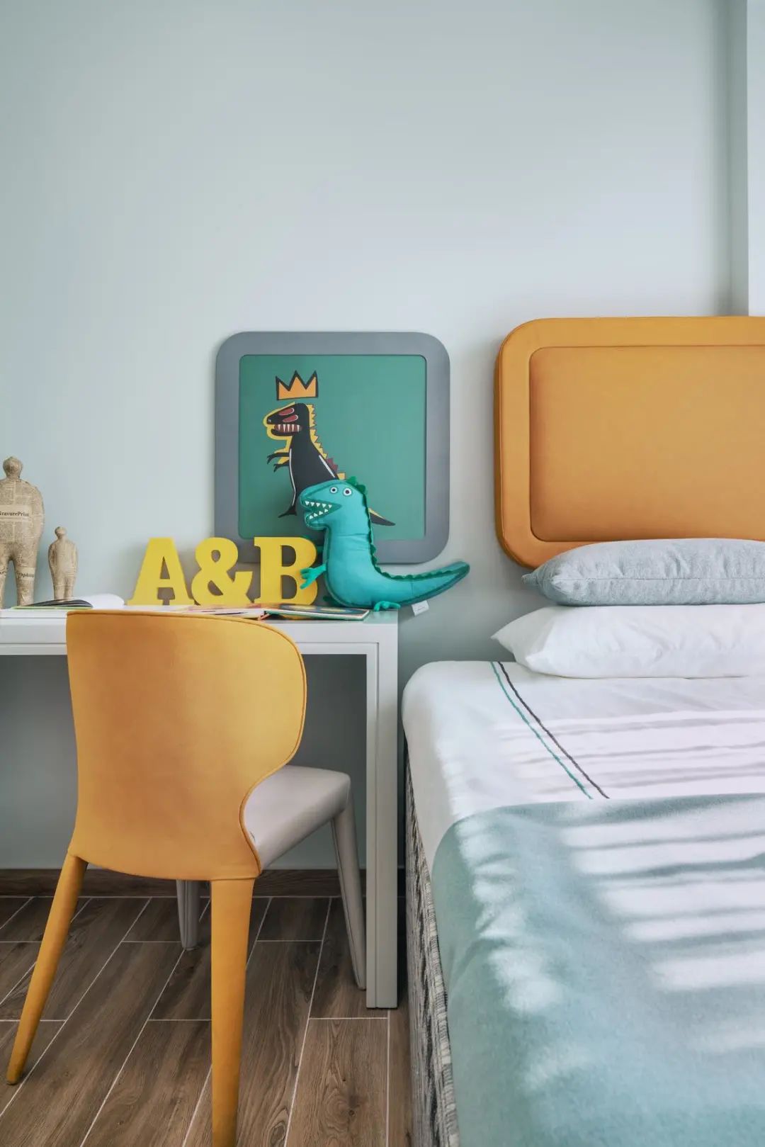 ▲儿童房整体以淡蓝色的空间,靠窗定制榻榻米床,连着床定制书桌,布置可爱的公仔、装饰画与装饰品,点缀橘色的床靠背、凳子与摆饰品,也点亮了空间的跳跃与活力感。