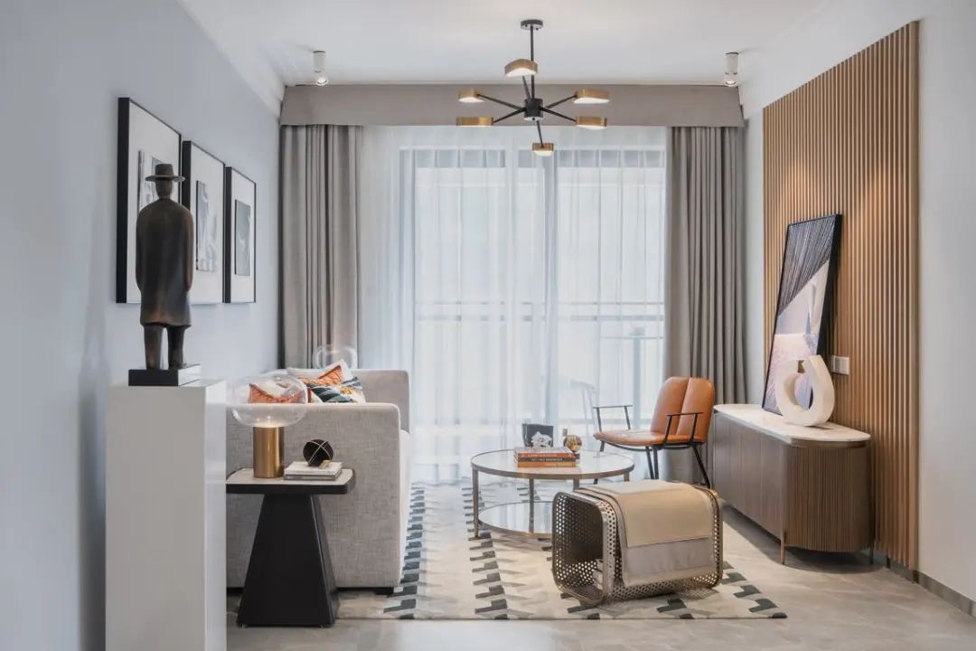 ▲客厅的摆设相对紧凑,蓝灰色沙发墙布置上浅灰色布艺沙发,电视墙则是以木色长城板,摆上轻奢风的电视柜,还有大理石台面圆茶几,休闲皮沙发椅,地面垫上一块地毯,整个空间显得现代精致而华丽档次。