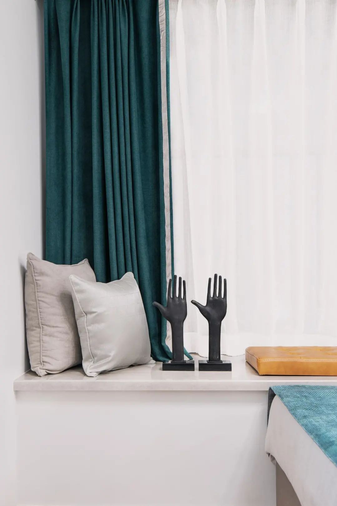 ▲飘窗的窗帘是麻蓝色的,布置抱枕、手形装饰品,带来一种活力感满满的清新与精致感。