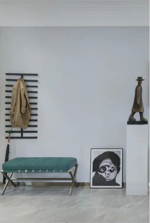 ▲玄关布置一个换鞋凳,墙面装饰收纳架,还有精致的装饰画与摆饰品,让空间显得更加高级时尚而简雅。