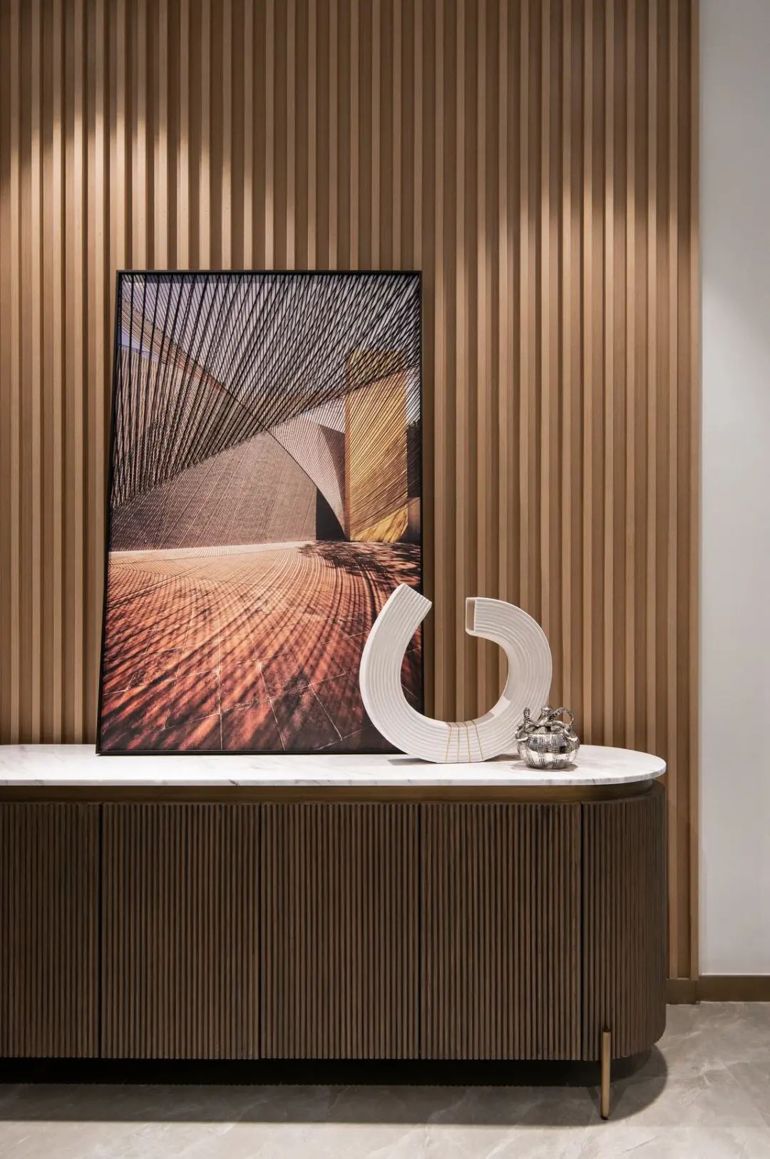 ▲电视柜在大理石台面基础,摆上装饰画、展示品,也让空间显得更加现代有科技感。