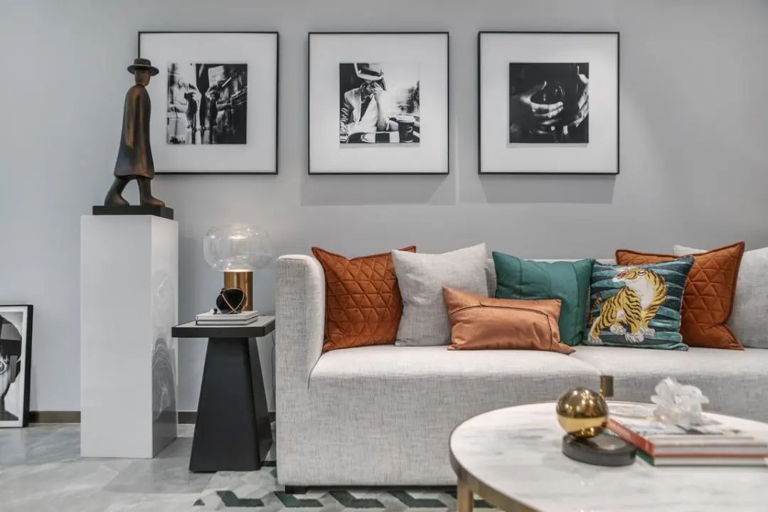 ▲沙发墙上挂几幅黑白调的方形装饰画,沙发旁边一个黑色小边几、摆上台灯,沙发上布置鲜艳的抱枕,茶几上也有杂志与球形装饰品,整个空间充满温馨与华丽感。