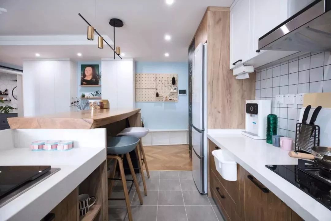 在面积比较小的小户型中,餐厅空间缺失是很常见的户型BUG,但是通过设计的手段加持,也不是不可以实现。比如说:开放式厨房+吧台