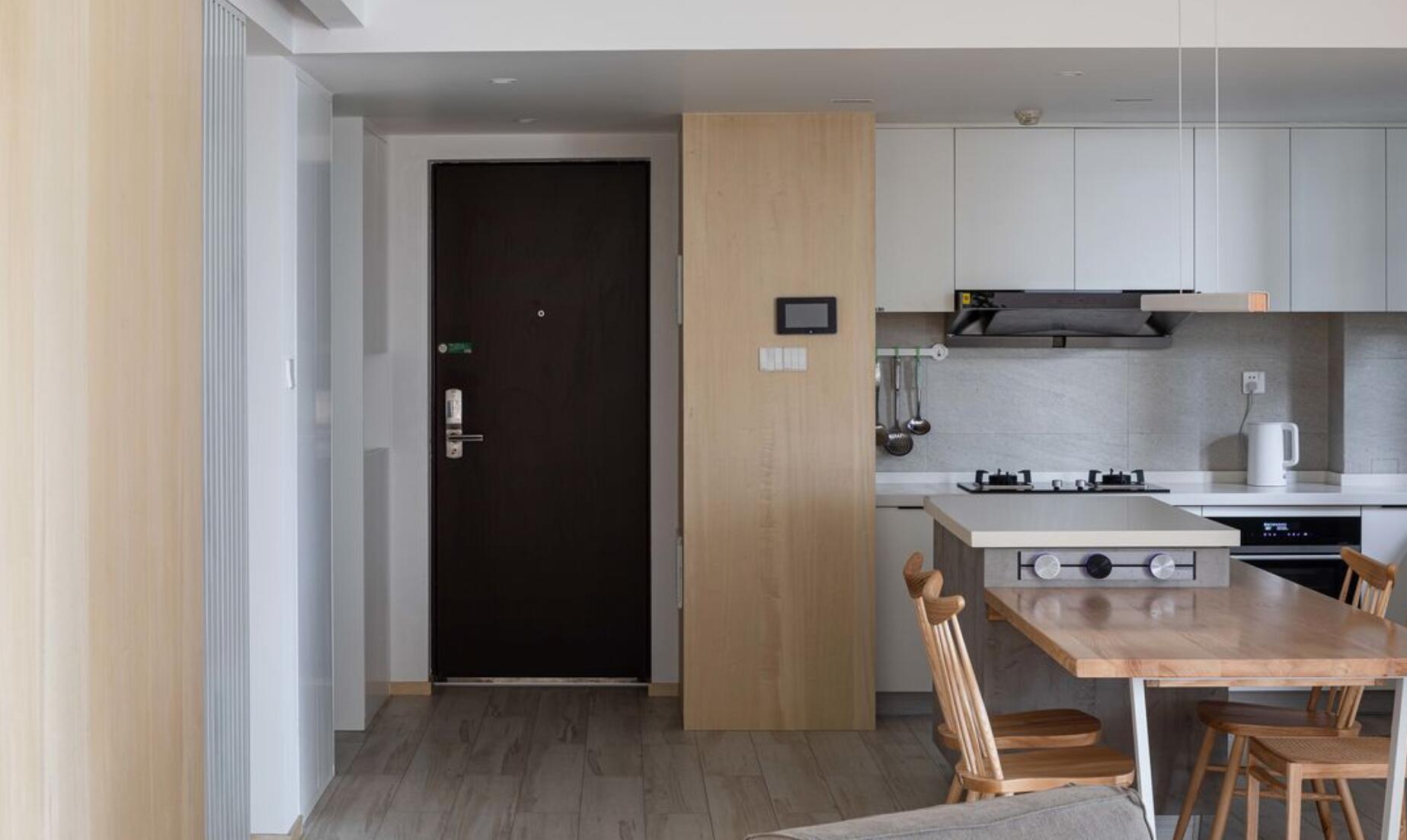 原入户有一个小玄关区,但也正因为该玄关区的存在,导致入户的采光受到了很大的影响。因此,将厨房墙体拆掉,并以开放式来定位,立马就为入户区弥补了采光。同时,空间这样设计后,还让厨房与客餐厅形成了一体化空间结构,解决了原客餐厅开间只有6米的问题。