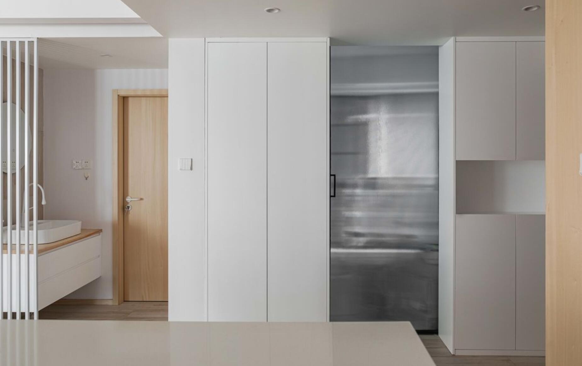 而门洞两边的入墙式鞋柜设计,则分别满足了日常鞋子及衣物的收纳需求。当然,给该房间安装上玻璃门,也间接性弥补了入户的采光。