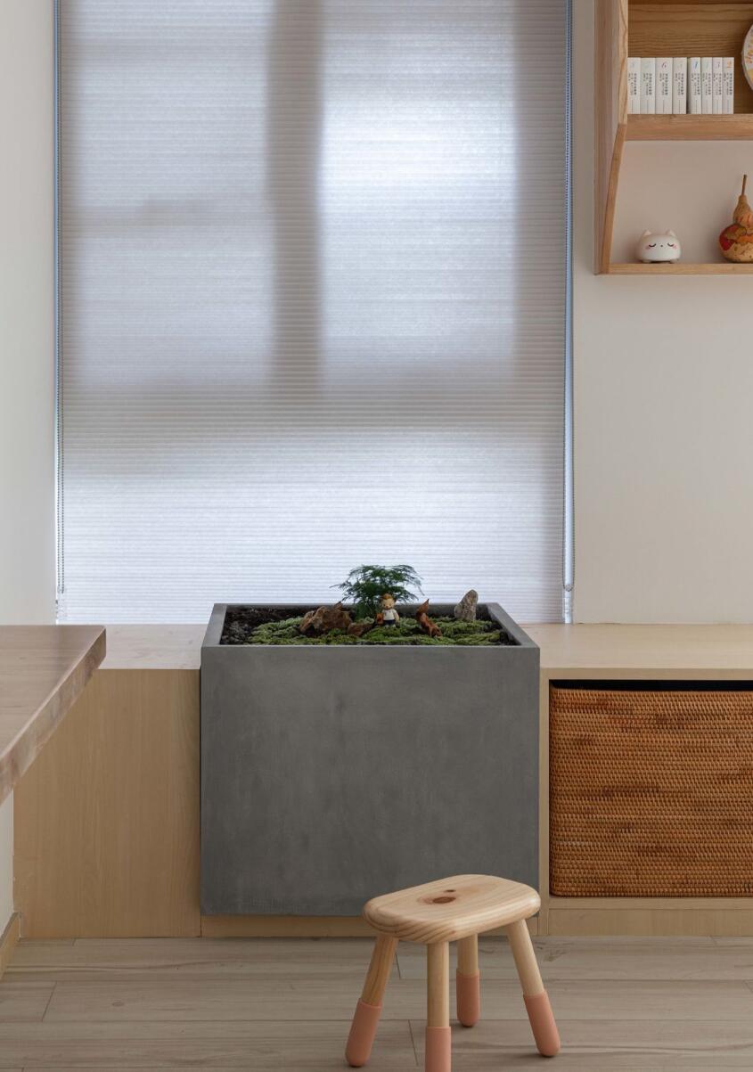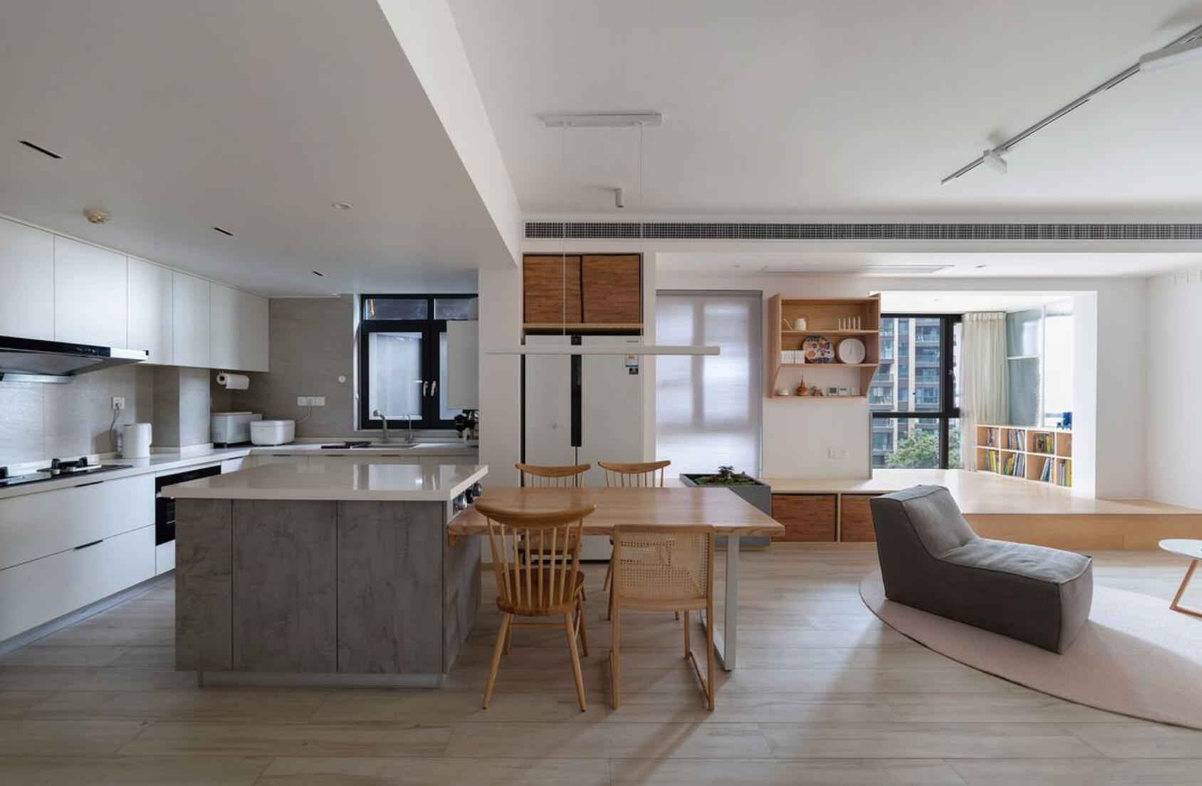 由于门洞旁边的部分墙体不可拆,所以直接将餐厅旁边的窗户改成飘窗结构,并将冰箱做成内嵌式结构,既合理利用了空间,也让空间更加工整了。同时,在飘窗台中间内嵌一盆植物,也是空间中的一大亮点,完美营造出了共生共长的高级感。