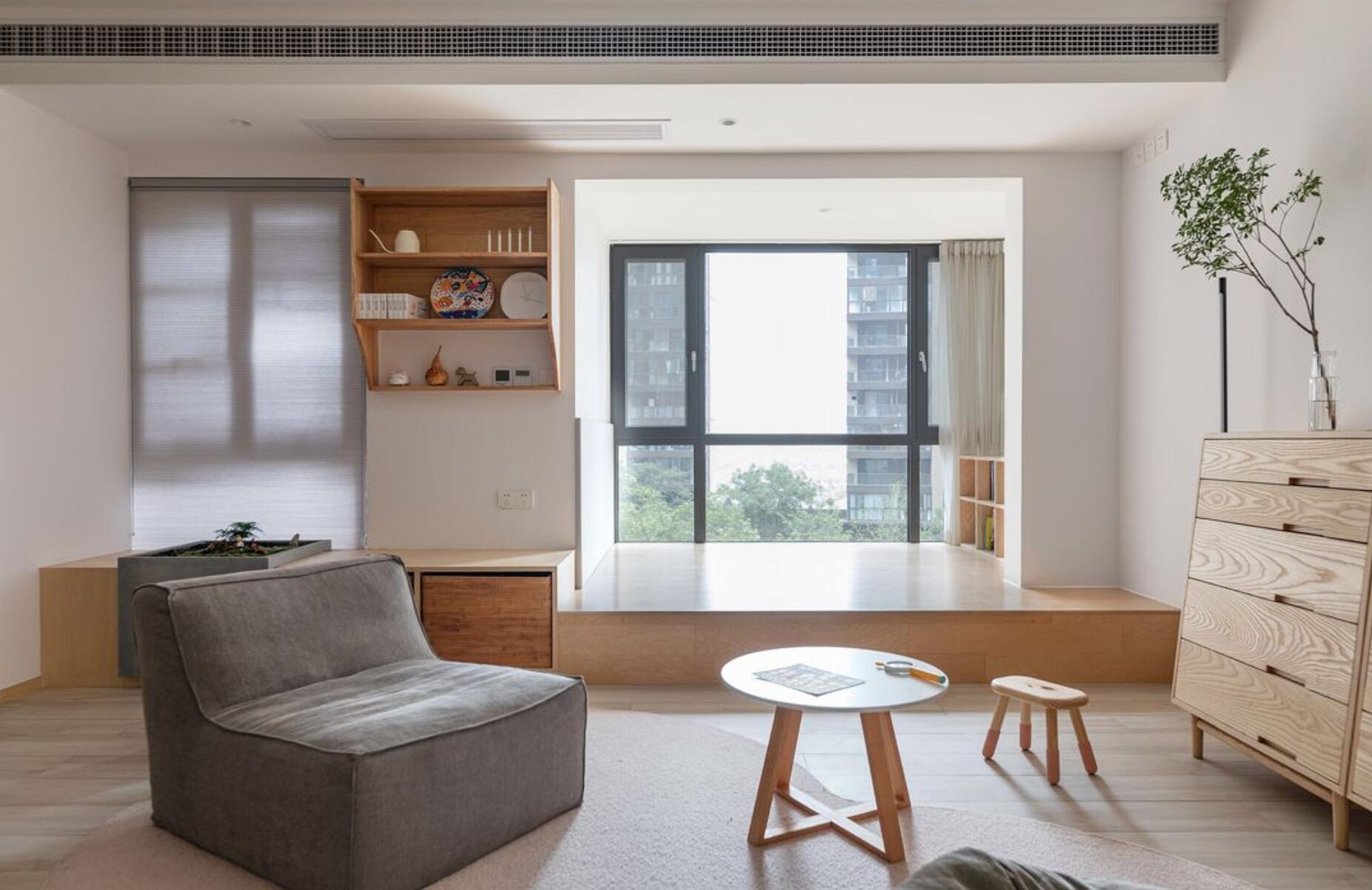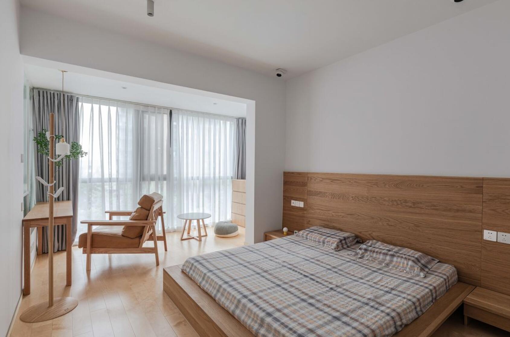 主卧同样采用了“减少设计”,甚至就连床都做成了地台的形式;而为了提高空间的层次,给床头包上护墙板,也营造出了温馨、雅致的空间气息。