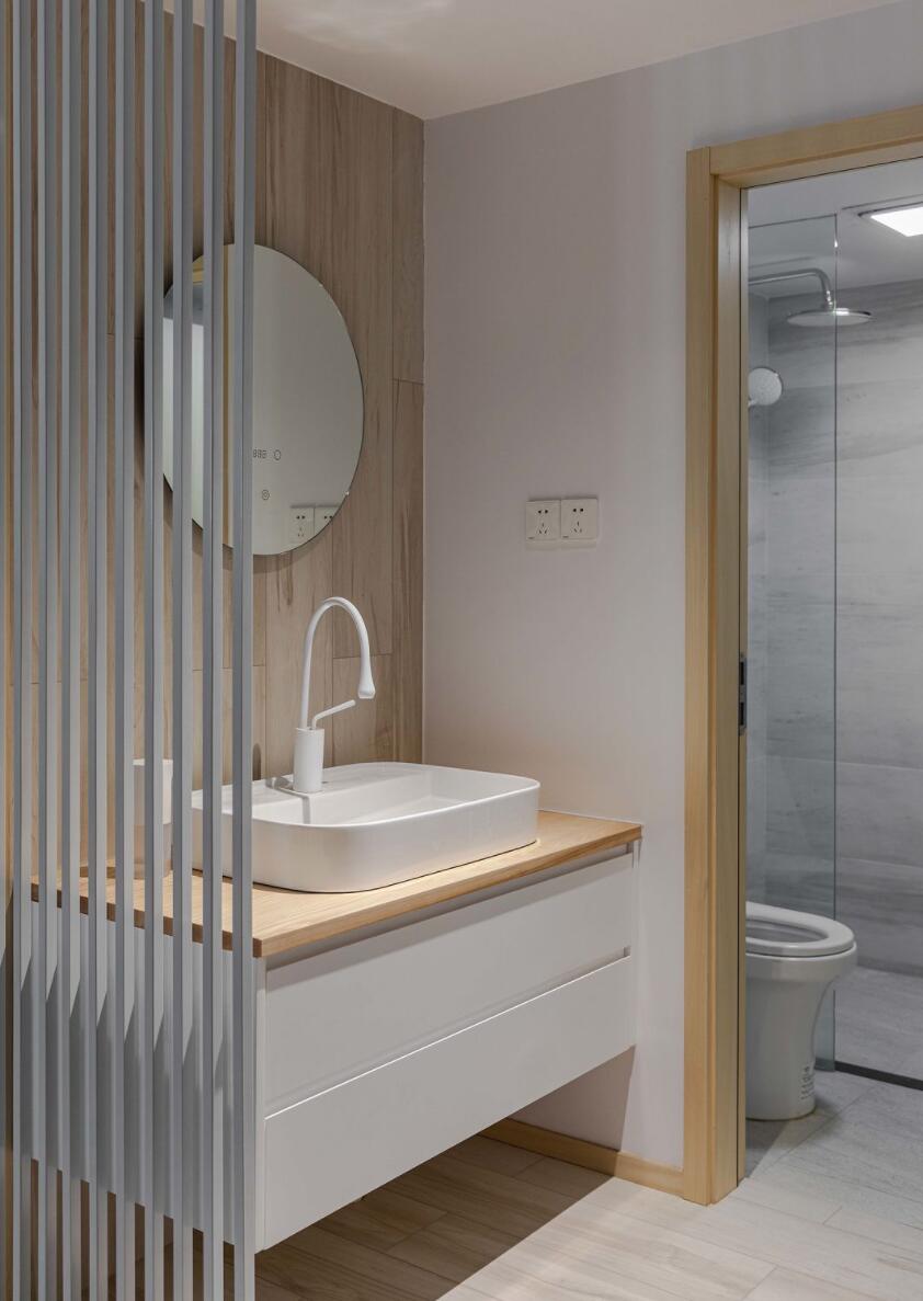 考虑到外卫在入户第一视角,所以采用干湿分离来设计,既能提高空间使用率,又能增加美观度。同时,为了保证空间的整体性,给干区墙面贴上木纹瓷砖,也算是家里的一大亮点了。