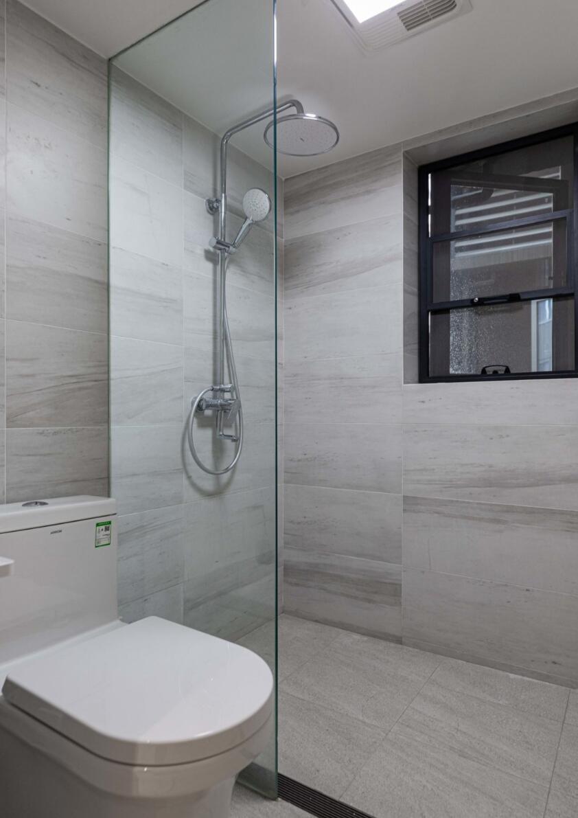 卫生间内部以高级灰为主调,考虑到空间比较小,利用一扇钢化玻璃来隔断,虽没有淋浴间阻水效果好,但实用性却很强。