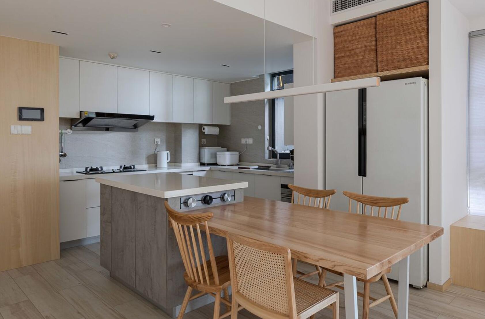 而利用中岛台当作餐厨间的隔断,也是实用性的体现。不管是储物、操作,还是当作备餐台来使用,都非常方便。尤其是岛台侧面的移动插座设计,更是满足了小电器的使用需求。