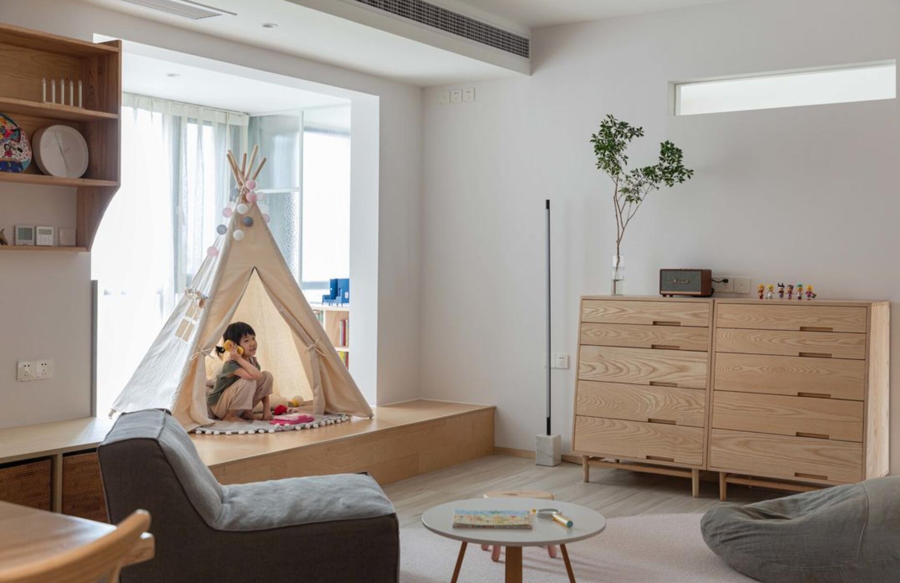 长阳台设计是最让屋主纠结的,因为超长的尺寸,本身就是空间的一大优势。不过最后为了让孩子有一块舒适的玩耍区,还是采用一分为二的方式,将客厅外面的阳台打造成了一块亲子、休闲区,以方便孩子玩耍活动。