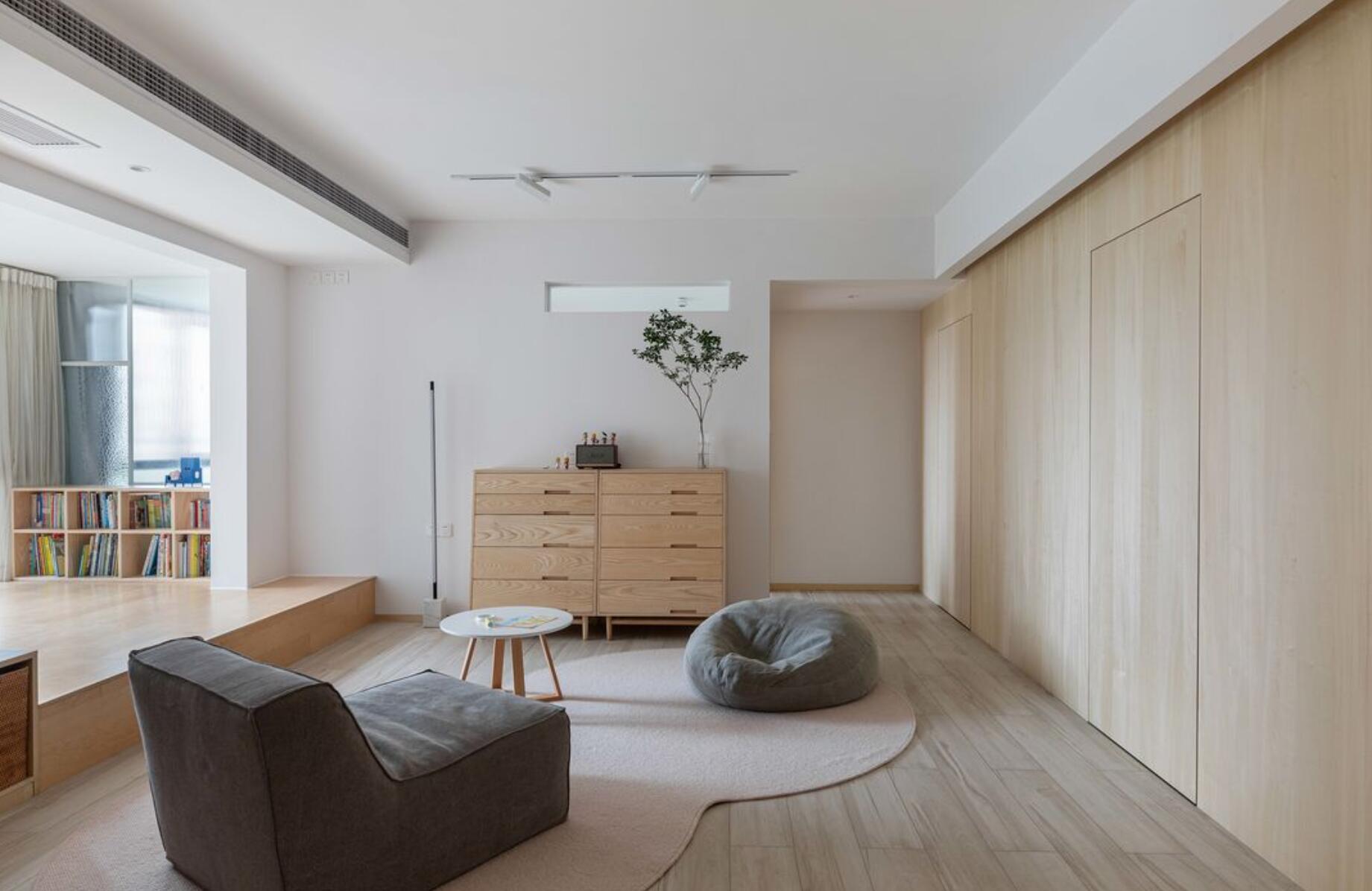 考虑到客厅的面积比较紧凑,采用当下流行的“减法设计”来处理,既为空间保留下了宽敞的空间感;单人沙发、豆袋以及地毯配置,又尽显生活的惬意。而给侧面过道墙体包上木饰面,则在弱化长过道的情况下,又为空间增添了一抹温润、清新的气息。