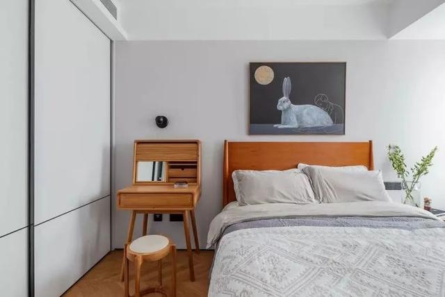 ▲父母房也是以灰色的墙面,布置实木床与梳妆台,床头墙挂一幅月兔装饰画,布置灰白配的床单与窗帘,也父母房显得简洁明亮而轻松自然。
