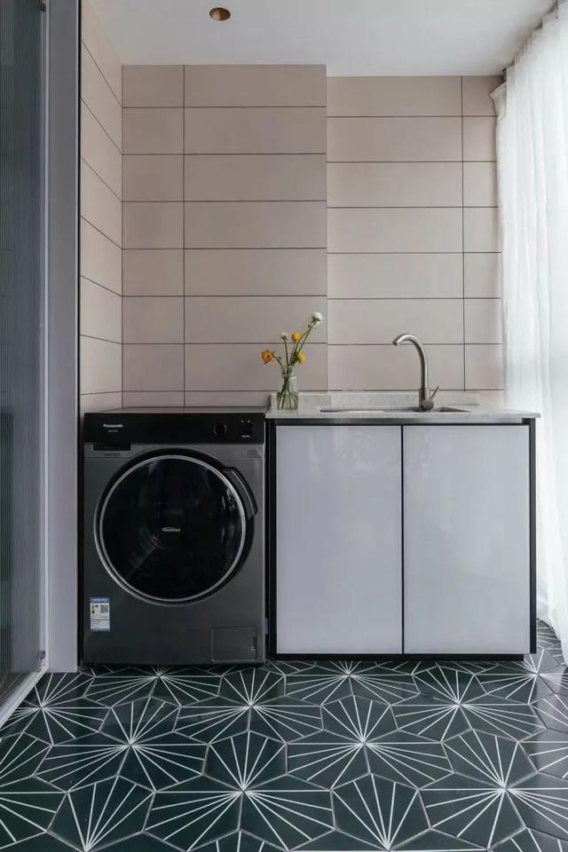 ▲阳台封起来装上纱帘,同时也是与厨卫空间一样的几何图案花砖,洗衣机+洗手盆柜组合的设计,带来一个实用而文艺的空间体验。